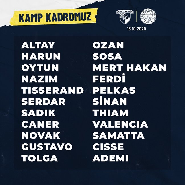 Buna göre sarı lacivertlilerde; Gökhan Gönül, Garry Rodrigues, Nabil Dirar, Perotti ve Ömer Faruk Beyaz, kadroya dahil edilmedi.