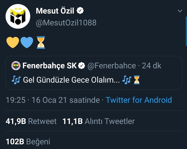 Bununla beraber Mesut Özil, sosyal medya hesabından Fenerbahçe'nin tweetini alıntıladı ve sarı lacivert kalp ile beraber kum saati emojisi paylaştı.