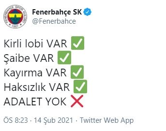 Sarı lacivertliler o paylaşımda hakem hatalarına değinirken, "Kirli lobi var, adalet yok" dedi.