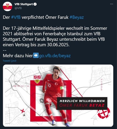 "Futbolcumuz Ömer Faruk Beyaz, Almanya'nın VfB Stuttgart kulübüyle anlaşmaya varmıştır. Sezon sonu kulübümüzle sözleşmesi sona erecek olan Ömer Faruk Beyaz'a bundan sonraki kariyerinde başarılar diliyoruz."