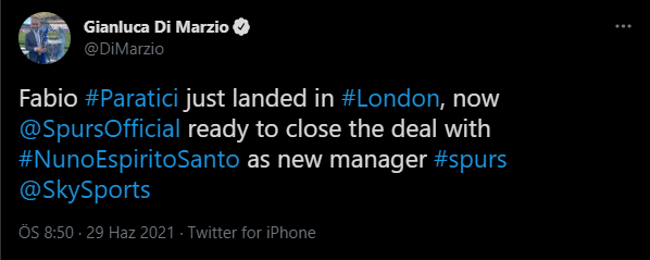 İtalyan gazeteci Di Marzio'nun aktardığı son dakika bilgisine göre, 1 Temmuz tarihinden itibaren Premier Lig temsilcisi Tottenham'da genel menajer olarak çalışmaya başlayacak olan Fabio Paratici, aradaki pürüzleri ortadan kaldırmak ve Nuno Santo'yu takımın başına geçirecek anlaşmayı sonlandırmak üzere uçakla Londra'ya indi.