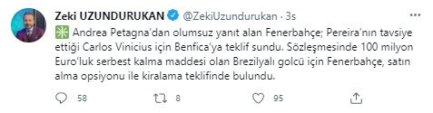 Fotomaç Gazetesi Genel Yayın Yönetmeni Zeki Uzundurukan'ın sosyal medya hesabından aktardığı habere göre, Andrea Petagna'dan olumsuz yanıt alan Fenerbahçe; Vitor Pereira'nın tavsiye ettiği Carlos Vinicius için Benfica'ya teklif sundu. Sözleşmesinde 100 milyon euro'luk serbest kalma maddesi olan Brezilyalı golcü için Fenerbahçe, satın alma opsiyonu ile kiralama teklifinde bulundu.