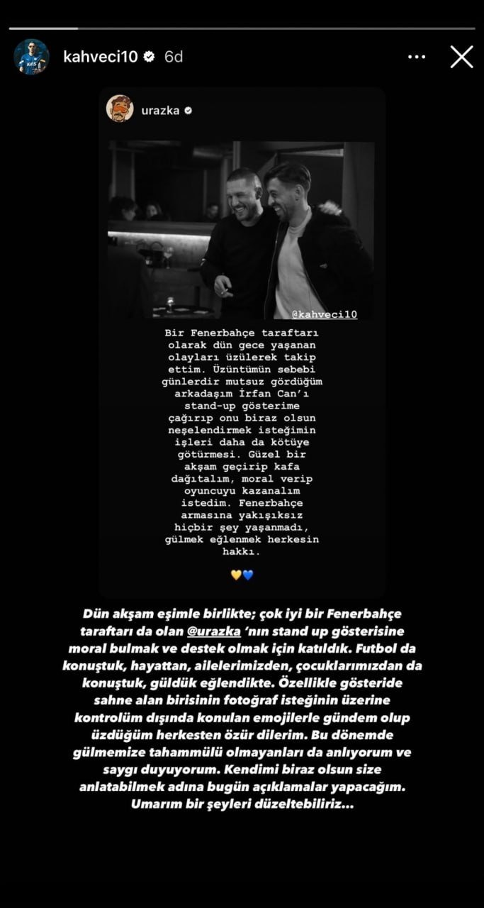 Dün akşam eşimle birlikte; çok iyi bir Fenerbahçe taraftarı da olan Uraz Kaygılaroğlu'nun stand-up gösterisine moral bulmak ve destek olmak için katıldık. Futbol da konuştuk, hayattan, ailelerimizden, çocuklarımızdan da konuştuk, güldük eğlendik de. Gösteride sahne alan birisinin fotoğraf isteğinin üzerine, kontrolüm dışında konulan emojilerle gündem olup üzdüğüm herkesten özür dilerim. Bu dönemde gülmemize tahammülü olmayanları da anlıyorum ve saygı duyuyorum. Kendimi biraz olsun size anlatabilmek adına bugün açıklamalar yapacağım. Umarım bir şeyleri düzeltebiliriz.