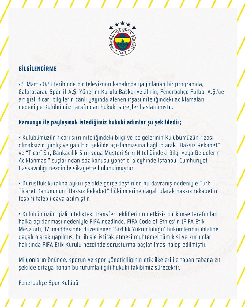 29 Mart 2023 tarihinde bir televizyon kanalında yayınlanan bir programda, Galatasaray Sportif A.Ş. Yönetim Kurulu Başkanvekilinin, Fenerbahçe Futbol A.Ş.'ye ait gizli ticari bilgilerin canlı yayında alenen ifşası niteliğindeki açıklamaları nedeniyle Kulübümüz tarafından hukuki süreçler başlatılmıştır.