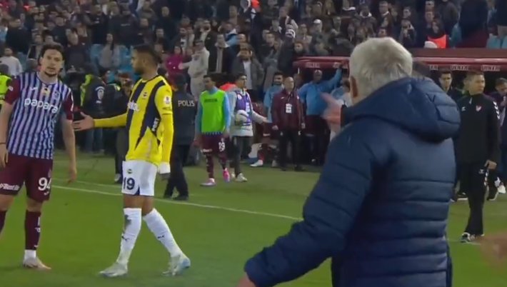 Sofyan Amrabat'ın 90+12'de gelen golüyle dev maçta 3 puanı alan sarı lacivertli ekibin Portekizli teknik direktörü Jose Mourinho, mücadele bitiminde saha içinde bordo mavili futbolcu Enis Destan'la sözlü tartışmaya girdi.