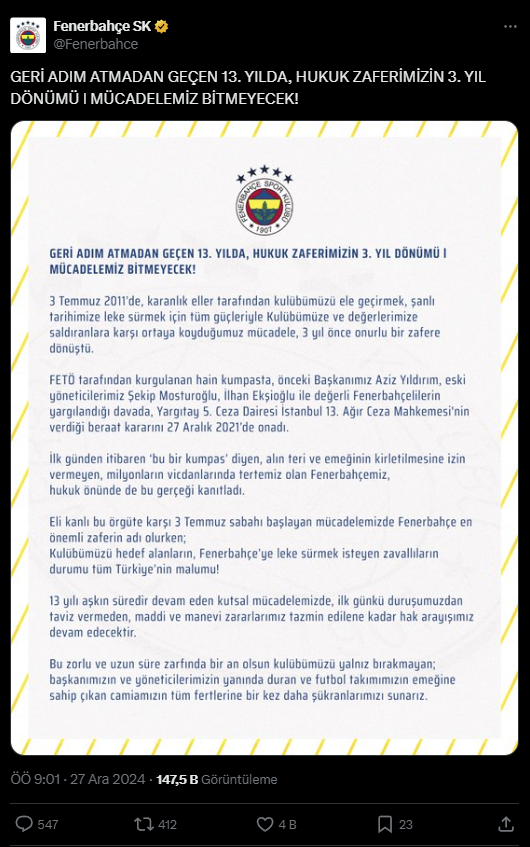 FETÖ tarafından kurgulanan hain kumpasta, önceki Başkanımız Aziz Yıldırım, eski yöneticilerimiz Şekip Mosturoğlu, İlhan Ekşioğlu ile değerli Fenerbahçelilerin yargılandığı davada, Yargıtay 5. Ceza Dairesi İstanbul 13. Ağır Ceza Mahkemesi'nin verdiği beraat kararını 27 Aralık 2021'de onadı.