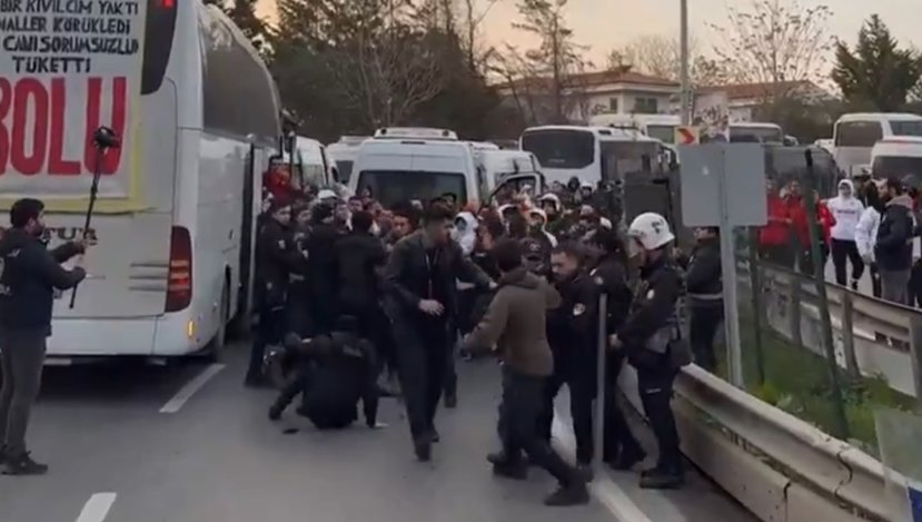 Taraftarları taşıyan her otobüsün ve midibüsün içerisinde emniyet yetkilileri yer alırken taraftarların araçlardan inişinde arbede yaşandı. Yüzünü kapatmak isteyen Göztepe taraftarlarını polisler açmaları konusunda uyardı. Arbedede bir polis memurunun yere düştüğü görüldü.