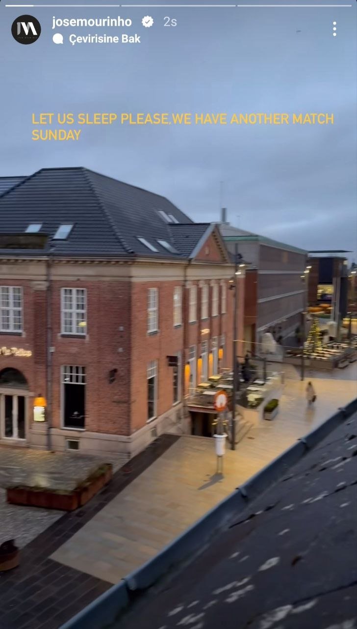 Fenerbahçe, UEFA Avrupa Ligi'nin 8. ve son haftasında Danimarka ekibi Midtjylland ile deplasmanda 2-2 berabere kaldı ve 24. sıradan UEFA Avrupa Ligi play-off turuna katılmaya hak kazandı. Karşılaşmanın ardından geceyi Danimarka'da geçiren sarı-lacivertli ekipte teknik direktör Jose Mourinho sosyal medya hesabından sabah saatlerinde şehirdeki gürültüyü paylaştı. Portekizli çalıştırıcı paylaşımına, "Uyumamıza izin verin lütfen, pazar günü maçımız var" notunu düştü.