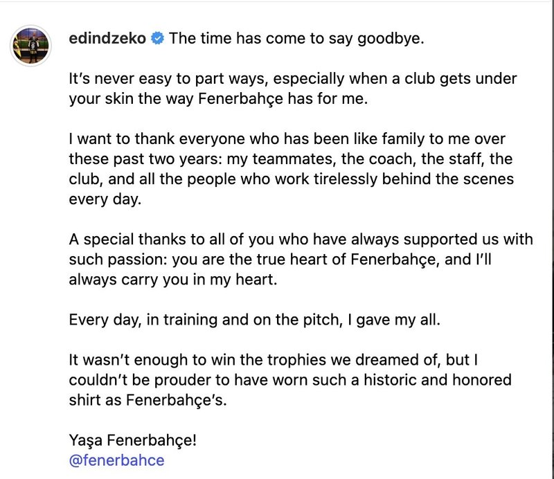 Fenerbahçeli futbolcu Edin Dzeko, resmi sosyal medya hesabından bir veda paylaşımı yaptı. 2023-2024 sezonundan bu yana sarı-lacivertli formayı giyen ve sözleşmesi mevcut sezonun bitimiyle birlikte sona erecek olan Dzeko, paylaşımında şu ifadeleri kullandı: