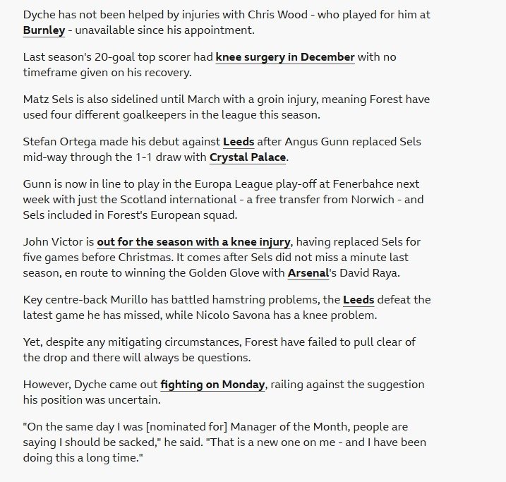 Çarşamba akşamı Nottingham Forest'ın başında 25. maçına çıkacak olan Dyche'ın takımı, düşme hattındaki West Ham'ın sadece iki puan önünde bulunuyor.