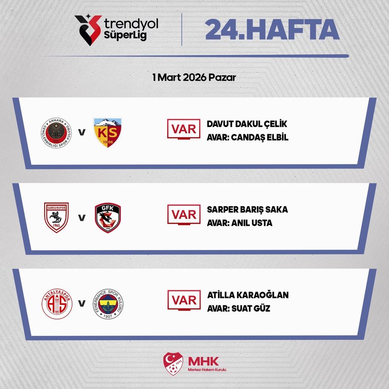 Hesap.com Antalyaspor ile Fenerbahçe, Trendyol Süper Lig'in 24. haftasının kapanış gününde karşı karşıya gelecek. Mücadelenin VAR hakemi ise Atilla Karaoğlan olarak açıklandı. Karaoğlan'a AVAR'da ise Suat Güz'ün eşlik edeceği belirtildi.