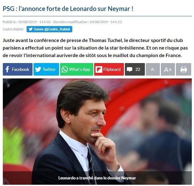 Sportif direktör Leonardo yaptığı açıklamayla, yıldız oyuncu için transfer görüşmeleri yaptıklarını ve ilerleme kaydettiklerini söyledi. Takım adı vermeyen Leonardo sözlerini "PSG henüz onay vermedi" diyerek sürdürdü.