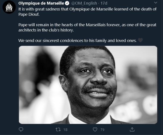 Olimpik Marsilya Kulübü, hayatını kaybeden eski başkanları Pape Diouf için taziye mesajı yayımladı. Kulübün sosyal medya hesabından yapılan açıklamada, "Olimpik Marsilya, Pape Diouf'un ölümünü büyük bir üzüntüyle öğrendi. Pape, kulüp tarihinin en büyük mimarlarından biri olarak Marsilya halkının kalbinde sonsuza dek kalacak. Ailesine ve sevenlerine başsağlığı diliyoruz" denildi.