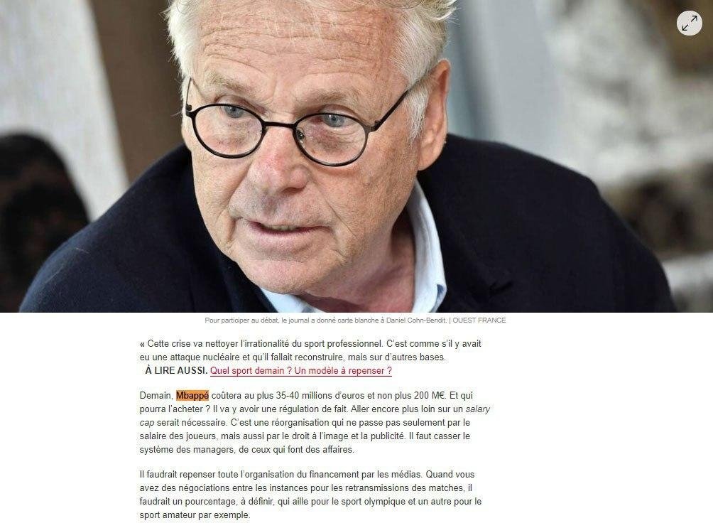 Fransız siyasetçi Daniel Cohn-Bendit, Ouest-France'a yaptığı açıklamada genç yıldızın 200 milyon Euro olarak konuşulan piyasa değerinin salgın sonrası 40 milyon Euro'lara kadar düşeceğini dile getirdi. Virüs salgınına "nükleer saldırı" benzetmesini yapan Bendit, "Mbappe yarın bir gün en fazla 35-40 milyon Euro edecek, söylenildiği gibi 200 milyon Euro değil" dedi.