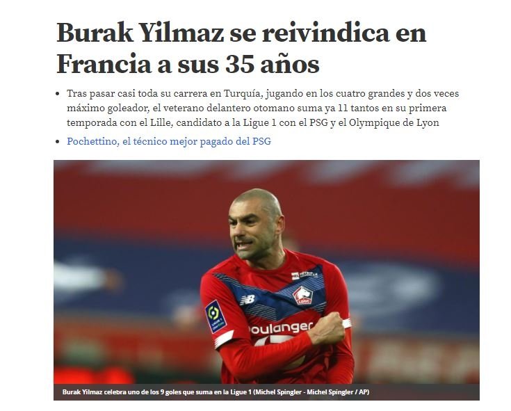 Mundo Deportivo'da Burak Yılmaz üzerine yazılan analiz haberde, milli yıldızın yaşının 35 olmasına rağmen Lille'den ayrılan Osimhen ile Remy'nin boşluğunu fazlasıyla doldurduğuna vurgu yapıldı. Kariyerinde '4 Büyükler'de forma giydiği ve iki kez gol kralı olarak kendini kanıtlağı ifade edilirken, hocası Galtier'in de onunla ilgili şu sözleri hatırlatıldı: