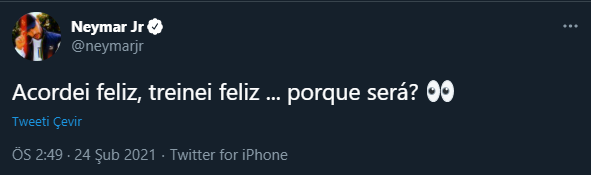 "Mutlu uyandım, mutlu antrenman yaptım. Nedenini merak ediyorum?" şeklinde tweet atan Neymar'ın bu sözleri, 'takımda kalacağının bir sinyali' şeklinde yorumlandı.