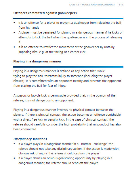 - Eğer bir oyuncu "normal bir mücadele" sırasında tehlikeli harekette bulunmuşsa hakem herhangi bir cezalandırmada bulunmamalıdır. Eğer hareket bir sakatlık yaratabilecek türden ise hakem kesinlikle oyuncuyu uyarmalıdır.