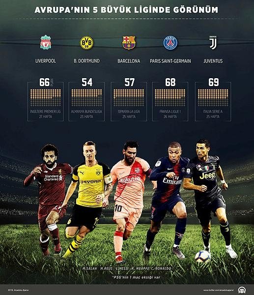 İngiltere'de Liverpool, İspanya'da Barcelona, İtalya'da Juventus, Almanya'da Borussia Dortmund, Fransa'da ise Paris Saint-Germain (PSG), puan tablosunun zirvesinde yer aldı.