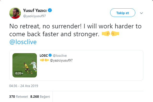 İngilizce olarak tweet atan Yusuf Yazıcı, "Geri çekilmek ve teslim olmak yok! Daha hızlı ve güçlü geri dönmek için çok çalışacağım" dedi.