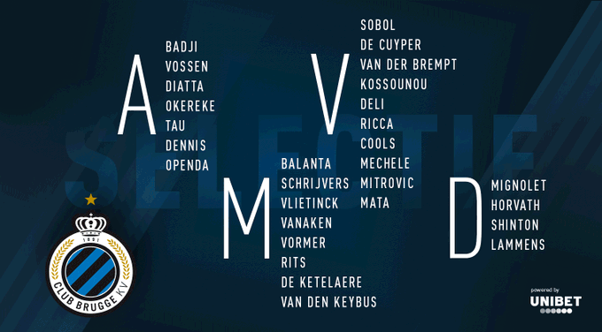 Badji, Vossen, Diatta, Okereke, Tau, Dennis, Openda, Balanta, Schrijvers, Vlietinck, Vanaken, Vormer, Rits, De Keteleare, Van den Keybus, Sobol, De Cuyper, Van der Brempt, Kossounou, Deli, Ricca, Cools, Mechele, Mitrovic, Mata, Mignolet, Horvath, Shinton, Lammens.