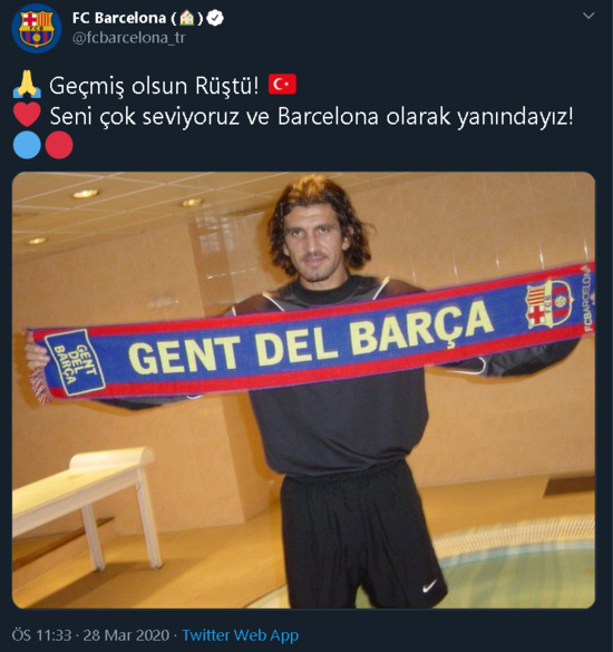 Corona virüsü testi pozitif çıkan ve hastaneye kaldırılan Rüştü Reçber'e ilk destek eski takımı Barcelona'dan geldi. Katalan devi sosyal medya hesabından efsane kalecinin Barça forması giydiği fotoğrafı paylaşıp, "Geçmiş olsun Rüştü! Seni çok seviyoruz ve Barcelona olarak yanındayız" ifadesini kullandı.