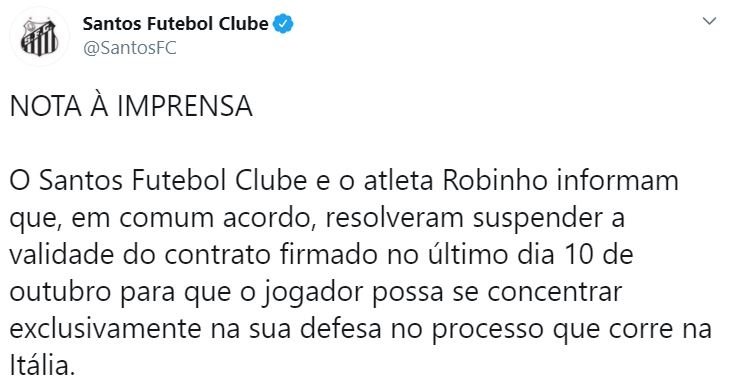 Yaşanan kriz sonrası tecrübeli oyuncu kulüp yönetimi ile bir araya gelerek mukavelesini sonlandırdı. Sosyal medya hesabı üzerinden bir açıklama yapan Robinho, "Çok üzülerek söylüyorum, Santos başkanıyla birlikte sözleşmemi feshetme kararı aldık. Masumiyetimi ispat edeceğim" ifadelerini kullandı.