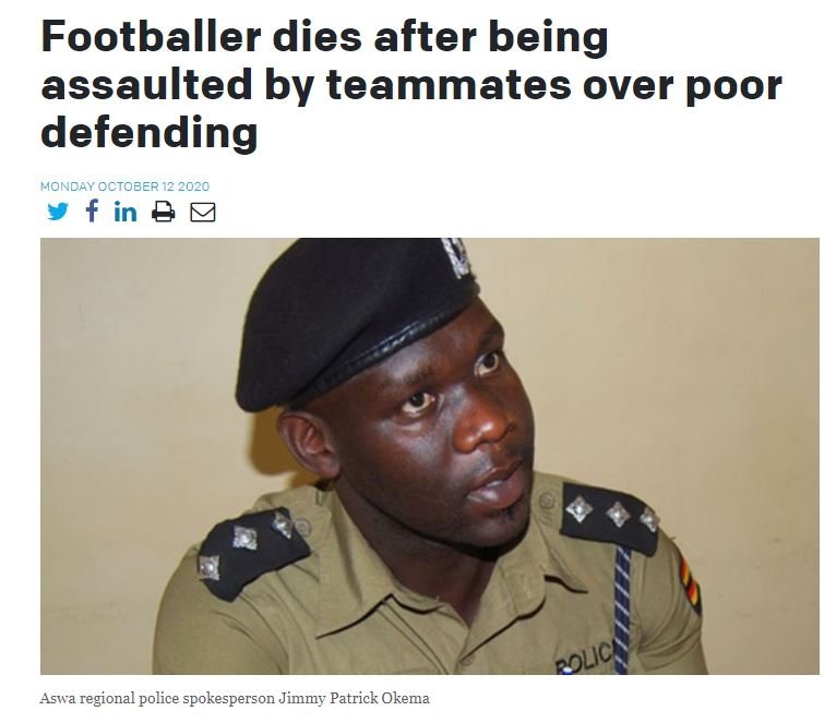 Uganda'nın Lamwo bölgesindeki yerel bir ligde oynanan maçta, skandal bir olay yaşandı. Daily Monitor'da yer alan habere göre Churchill Owaci adlı futbolcu, takımının gol yemesine neden olduğu için takım arkadaşları tarafından dövüldü. Hastanenin aciline kaldırılan 22 yaşındaki genç oyuncu hayatını kaybetti.