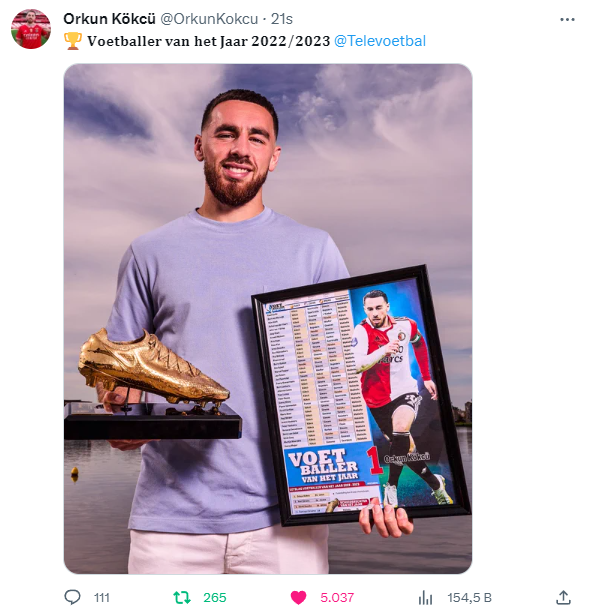 Milli futbolcu Orkun Kökçü, Hollanda Birinci Ligi'nde (Eredivisie) 2022-2023 sezonunun en iyi oyuncusu seçildi.