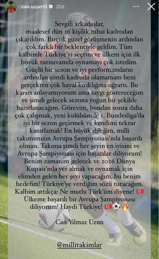 Geçtiğimiz sezon Nürnberg ile gösterdiği performansla A Milli Takım'ın geniş kadrosuna çağırılan ancak 26 kişilik son kadroya kalamayan Can Uzun sosyal medya hesabından bir paylaşımda bulundu.
