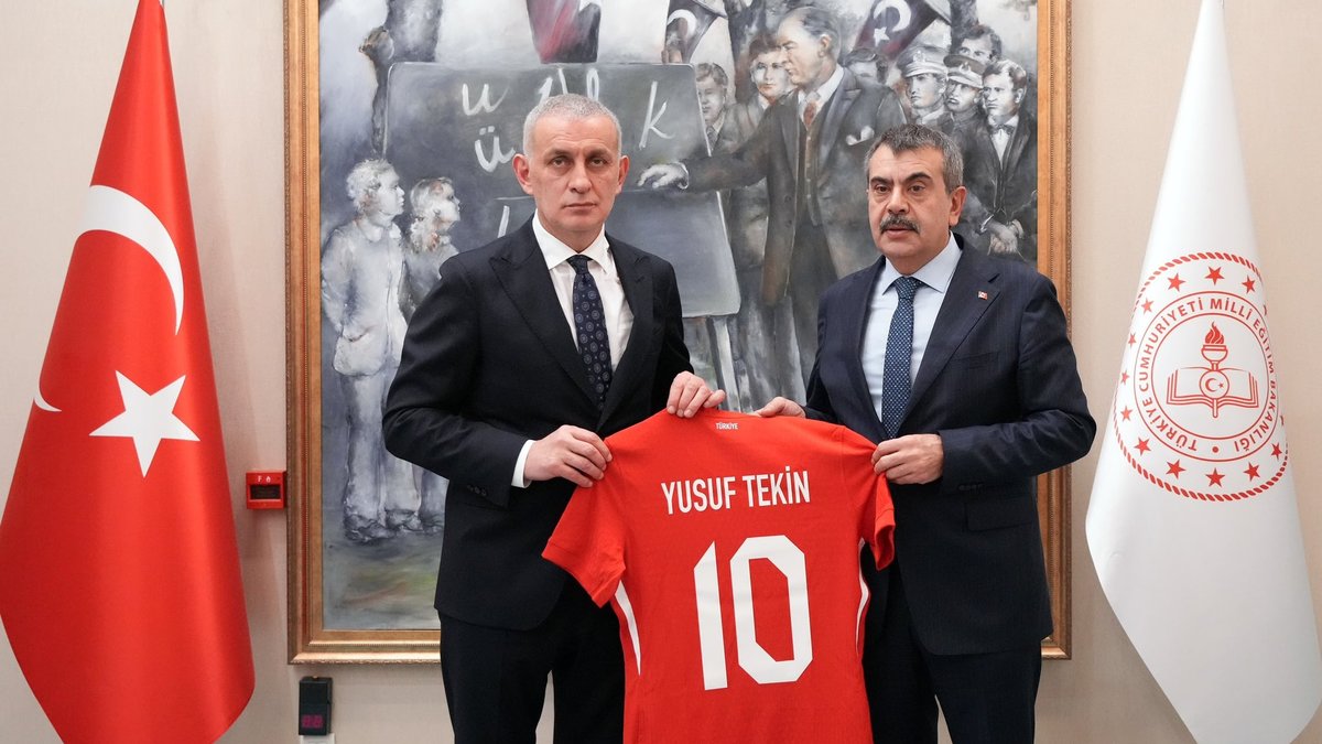 TFF Başkanı İbrahim Ethem Hacıosmanoğlu, Bakan Yusuf Tekin'e ziyaretin sonunda üzerinde isminin yazılı olduğu A Milli Takım forması hediye etti.