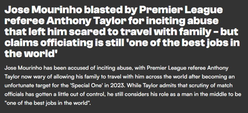 Premier League'in tecrübeli hakemlerinden Anthony Taylor, 2023 yılında oynanan Sevilla–Roma UEFA Avrupa Ligi finali sonrasında Jose Mourinho ile yaşadığı olayları anlattı. Taylor, o dönemde uğradığı hakaret ve tehditlerin kendisini ve ailesini derinden etkilediğini söyledi.