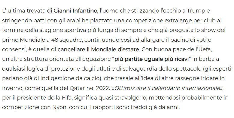 FIFA Başkanı Gianni Infantino, Roma’daki Avrupa Kulüpler Birliği toplantısında futbolda köklü bir değişikliğe hazırlanıldığını duyurdu. Infantino’nun planına göre Dünya Kupası artık yaz aylarında değil, yıl içinde düzenlenecek. İşte Infantino'nun açıklamaları...