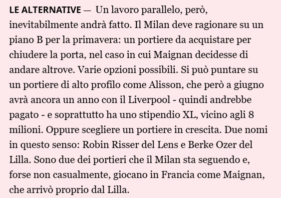 Kırmızı-siyahlıların listesinde Lens'in 21 yaşındaki kalecisi Robin Risser de bulunuyor. Ancak Maignan sonrası için hem tecrübeli hem de gelişime açık bir isim arayan Milan yönetiminin, penaltılardaki başarısı ve büyük maçlardaki soğukkanlılığıyla öne çıkan Berke Özer'e daha sıcak baktığı belirtiliyor.