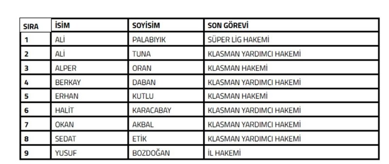 "Türkiye Futbol Federasyonu'nca yürütülen bahis soruşturması kapsamında; son 5 yılda TFF bünyesinde hakem olarak görev yapmış ve futbol dalında bahis oynadığı tespit edilen aşağıda isimleri yer alan kişilerin Futbol Disiplin Talimatı'nın 57. maddesi uyarınca 26.12.2025 tarihinden itibaren tedbirli olarak PFDK'ya sevk edilmesine karar verilmiştir."