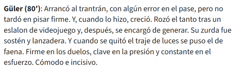 "Arda Güler maça yavaş başladı ve birkaç pas hatası yaptı. Ancak kısa sürede toparlandı ve maçın içine girmeyi başardı. Video oyunlarını andıran bir slalomla gole çok yaklaştı, ardından pozisyonlar üretmeye devam etti. Sol ayağını oyun kurulumunda son derece etkili kullandı. Çalışkan oyunuyla öne çıkan Arda, ikili mücadelelerde başarılıydı, ön alan baskısında kilit rol oynadı ve büyük bir efor sarf etti. Sahada rahat ve zekice hareket etti."