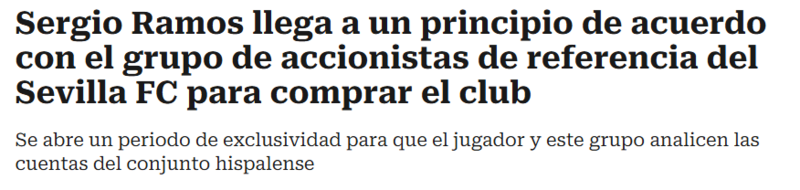 İspanya'nın saygın radyo istasyonlarından Cadena SER'in haberine göre; taraflar arasında yapılan görüşmelerde prensip anlaşmasına varıldı. Haberde, Sergio Ramos'un Sevilla'yı satın almak için 450 milyon euro bedel üzerinden kulüp sahipleriyle el sıkıştığı ifade edildi.