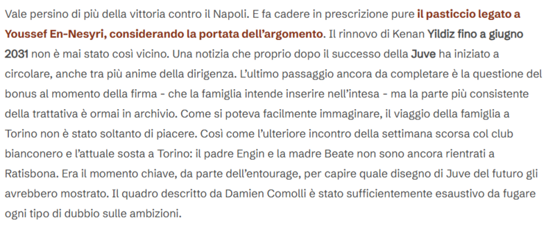 Juventus, uzun süredir gündemde olan Kenan Yıldız'ın yeni sözleşmesi için mutlu sona çok yaklaştı. İtalyan basınından Tuttosport'un aktardığına göre, Juventus ile Kenan Yıldız'ın ailesi arasında yapılan görüşmeler büyük ölçüde sonuç verdi.