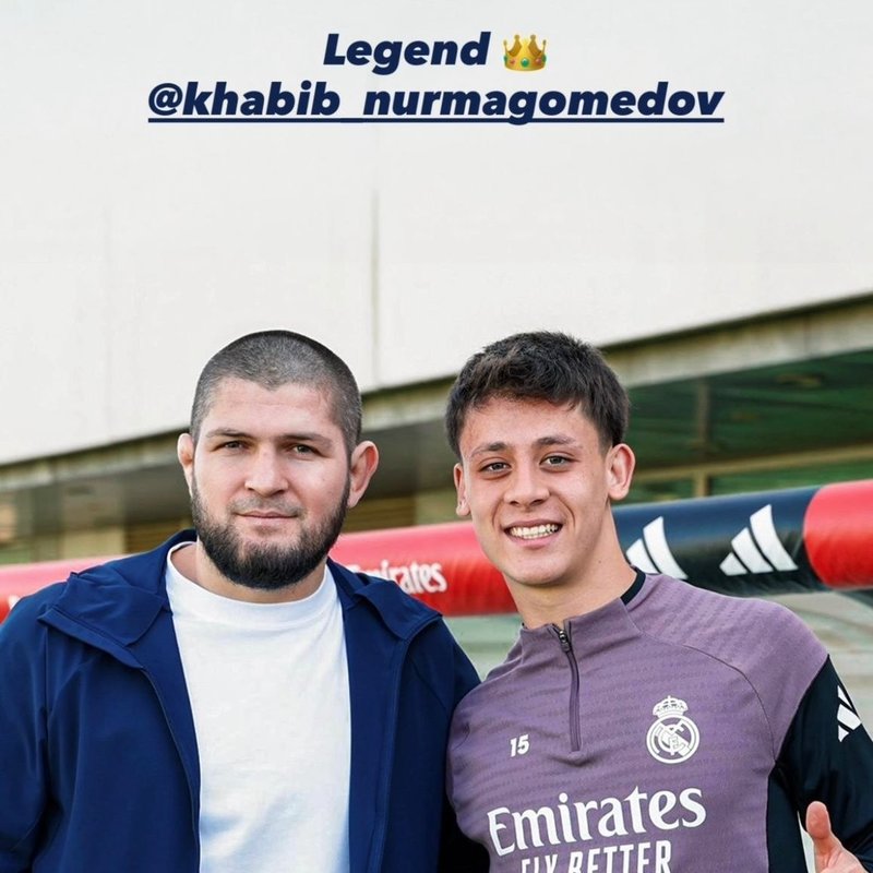 Real Madrid'de oynayan milli futbolcumuz Arda Güler, İspanyol ekibinin tesislerini ziyarete gelen UFC'nin efsane dövüşçülerinden Khabib Nurmagomedov ile bir araya geldi. Güler, o anları resmi sosyal medya hesabından paylaştı.