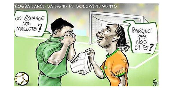 Didier Drogba'nın iç çamaşırı için bir sponsorla anlaşması ülkesinin basınında alaya alındı. Senegal ile karşılaşacak Fildişili yıldızın, forma değiştirmek isteyen bir rakibine iç çamaşırını değiştirmeyi teklif edeceği yönünde bir espri yapıldı