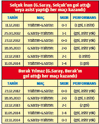 Süper Lig'de liderliğini sürdüren G.Saray'ın fikstürde kağıt üzerindeki en zor maçı belki de Trabzonspor deplasmanı... Aslan'ın fire vermek istemediği karşılaşmada en çok güvendiği isimler Selçuk İnan ve Burak Yılmaz. Cimbom'a bordo-mavililerden transfer olan 'kankalar' eski takımlarını affetmiyor. Kaptan Selçuk İnan son 5 maçta Trabzonspor ağlarını 2 kez havalandırırken 2 de asist yaptı. Burak Yılmaz'ın da Karadeniz Fırtınası'na karşı aynı dönemde 3 golü, 1 asisti bulunuyor. İşte ikilinin son 5 maçtaki Trabzonspor karnesi:
