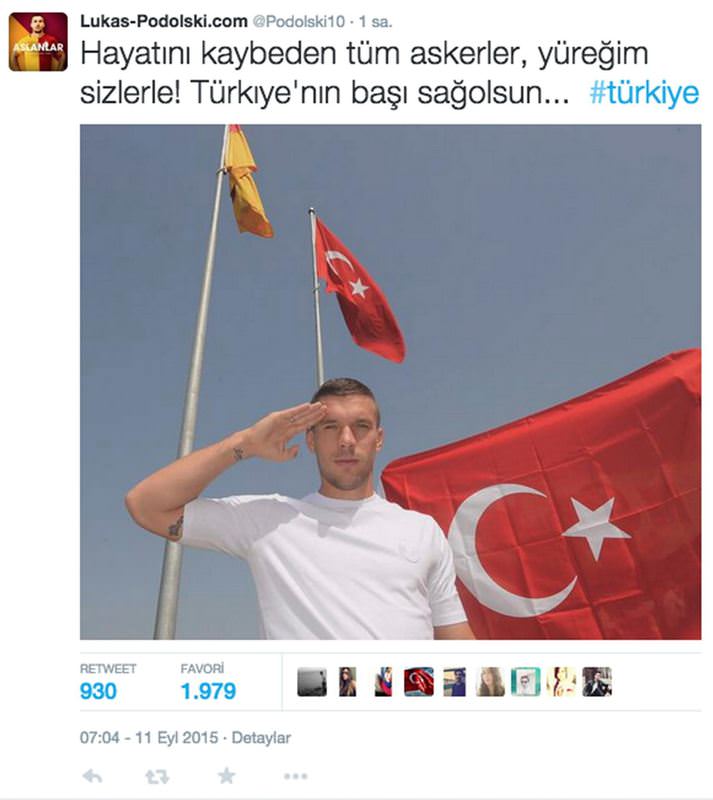 Aslan'a transfer olduğundan beri kültürümüze çabuk alışan Lukas Podolski, son günlerde yaşanan terör olaylarına tepki gösterdi. Alman futbolcu, twitter ve İnsagram hesabından Türk bayrağı önünde bir resim paylaştı. Asker selamı veren sarı-kırmızılı futbolcu fotoğrafın altına "Yüreğim sizlerle bayrak için toprağa düşen yüce asker! Türk Milleti'nin başı sağ olsun..." notunu düştü. Poldi bu hareketiyle sadece sarı-kırmızılı taraftarların değil yüreği şehit acısıyla yanan tüm vatandaşların gönüllerini fethetti.