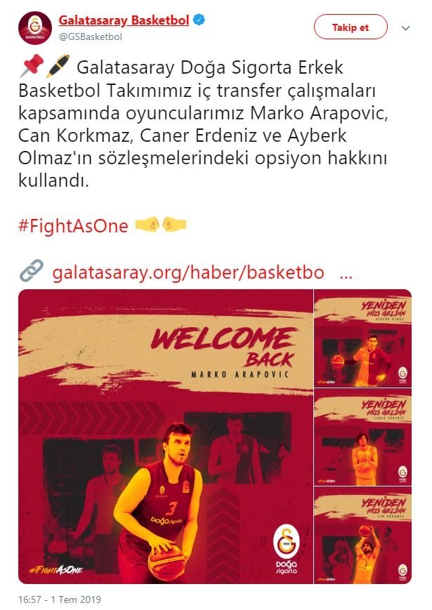 "Geçtiğimiz sezon Tahincioğlu Basketbol Süper Ligi'nde normal sezonu dördüncü sırada tamamladıktan sonra play-off yarı finaline yükselen kadrosunu korumak adına çalışmalarını sürdüren takımımızda Hırvat oyuncumuz Marko Arapovic ve yerli oyuncularımız Can Korkmaz, Caner Erdeniz ve Ayberk Olmaz'ın sözleşmelerindeki opsiyon hakları kullanıldı ve gelecek sezon öncesi oyuncularımız takımda kaldı. Yerli oyuncularımızdan Ege Arar ve Emir Gökalp'in sözleşmeleri ise kulübümüzle devam etmekte. Kulübümüzle sözleşmesi sona eren Erol Can Çinko ise takımımızdan ayrıldı."
