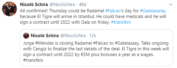Son dakika... Galatasaray beklendiği transferine kavuşuyor! Monaco forması giyen Radamel Falcao, Perşembe günü İstanbul'a gelecek ve sağlık kontrolünden geçecek. La Gazzetta dello Sport muhabiri Nicolo Schira'nın sosyal medya hesabından duyurduğu habere göre; Kolombiyalı golcü, cuma günü de kendisini Galatasaray'a bağlayan 3 yıllık sözleşmeyi imzalayacak.