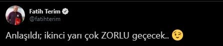 Galatasaray'da Fatih Terim'den sosyal medya üzerinden imalı bir paylaşım geldi. Fenerbahçe Başkanı Ali Koç ve Asbaşkan Semih Özsoy, Türkiye Futbol Federasyonu Başkanı Nihat Özdemir ve Merkez Hakem Kurulu Başkanı Zekeriya Alp'le bir görüşme gerçekleştirmişti. Bu görüşme Özdemir'in Zorlu'daki ofisinde yapılmıştı. Sarı-kırmızılı takımın teknik direktörü Fatih Terim, Göztepe maçından sonraki açıklamalarından sonra PFDK'ya sevk edildi. Bu kararın ardından sosyal medya hesabından Terim, ''Anlaşıldı; ikinci yarı çok ZORLU geçecek..'' paylaşımını yaptı. Sosyal medyada Fatih Terim'in bu paylaşımının Fenerbahçe cephesinin Zorlu'daki yaptığı görüşmeye bir gönderme olduğu iddia edildi.