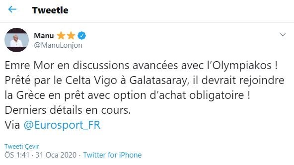 Fransız basınından Eurosport muhabiri Manu Lonjon sosyal medya hesabından genç futbolcunun, Yunanistan Ligi takımlarından Olympiakos'a zorunlu satın alma opsiyonu ile kiralanacağını açıklamıştı. Beklenen oldu... Emre Mor Olympiakos'a kiralandı. Genç oyuncu sezonu Yunan ekibinde tamamlayacak.