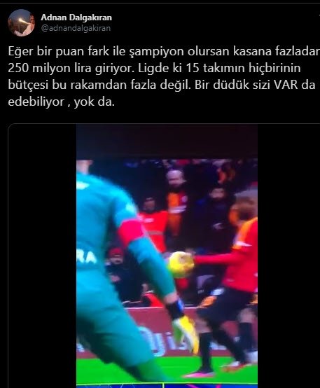 Dalgakıran yaptığı açıklamada; Eğer bir puan fark ile şampiyon olursan kasana fazladan 250 milyon lira giriyor. Ligde ki 15 takımın hiçbirinin bütçesi bu rakamdan fazla değil. Bir düdük sizi VAR da edebiliyor , yok da.'' ifadelerini kullandı.