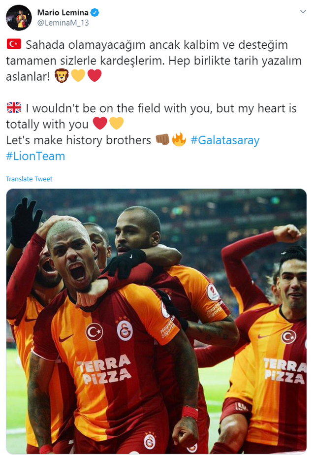 Aslan'ın orta sahasındaki yıldızı Mario Lemina, sakatlığı sebebiyle Fenerbahçe maçında yok. Gabonlu orta saha oyuncusu sosyal medya hesaplarından bir destek mesajı yayınladı. Lemina "Sahada olamayacağım ama kalbim ve desteğim tamamen sizlerle kardeşlerim. Hep birlikte tarih yazalım aslanlar" yazdı.