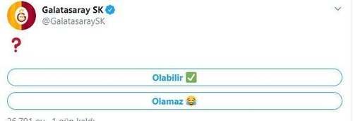 Kısa sürede binlerce beğeni ve yorum alan paylaşımın ardından bir de anket başlatan sarı-kırmızılı resmi hesap taraftarlarına 'Olabilir' 'Olamaz' seçenekleriyle 'Böyle bir şey olabilir mi?' sorusunu sordu.
