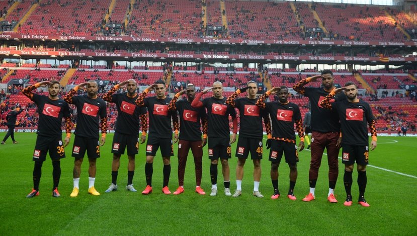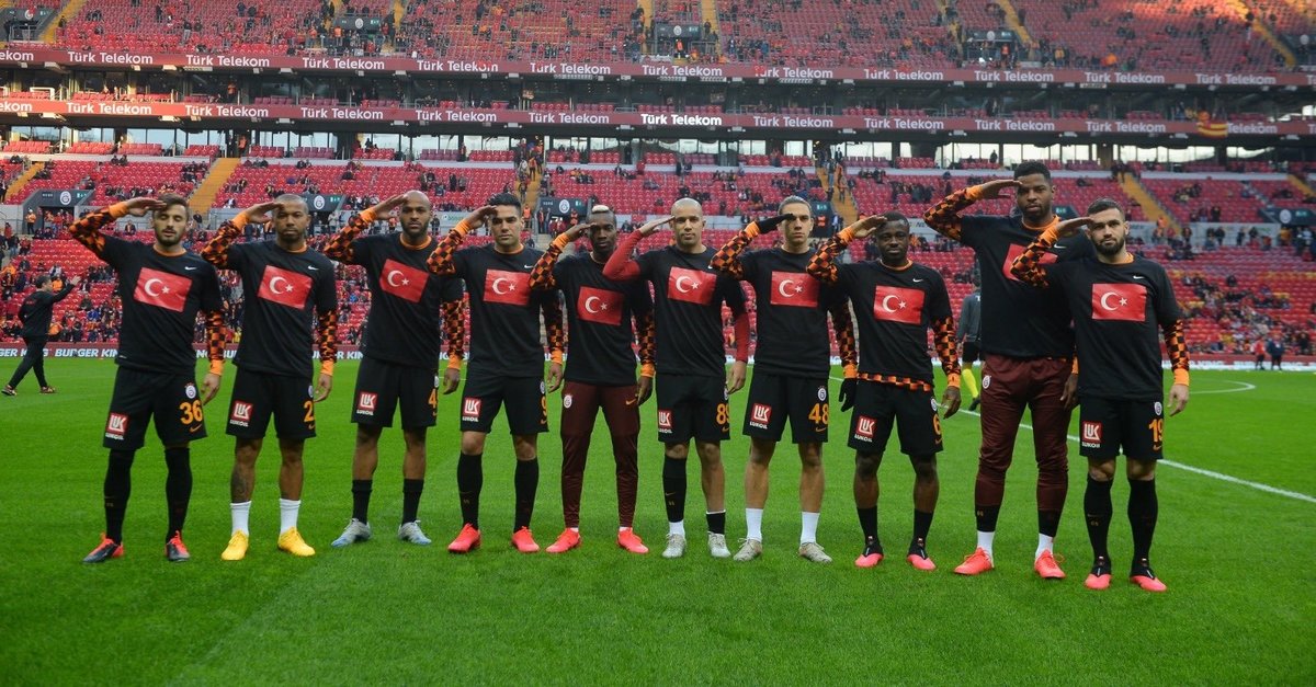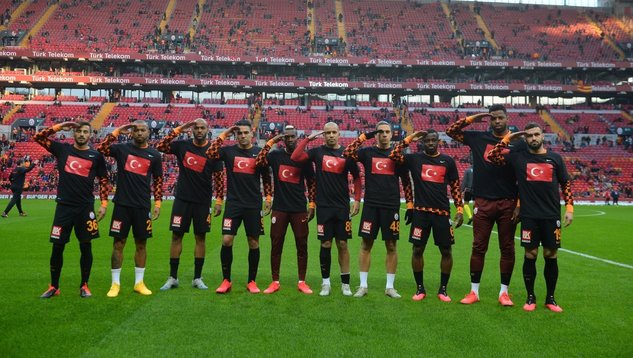 Galatasaraylı futbolculardan anlamlı bir hareket geldi. Türk Telekom Stadyumu'nda Gençlerbirliği'ni konuk eden sarı-kırmızılı futbolcular, sahaya Türk bayrağı tişörtüyle çıktı ve asker selamı verdi. Sarı-kırmızılı futbolcuların bu görüntüsü tribünlerden büyük destek gördü.