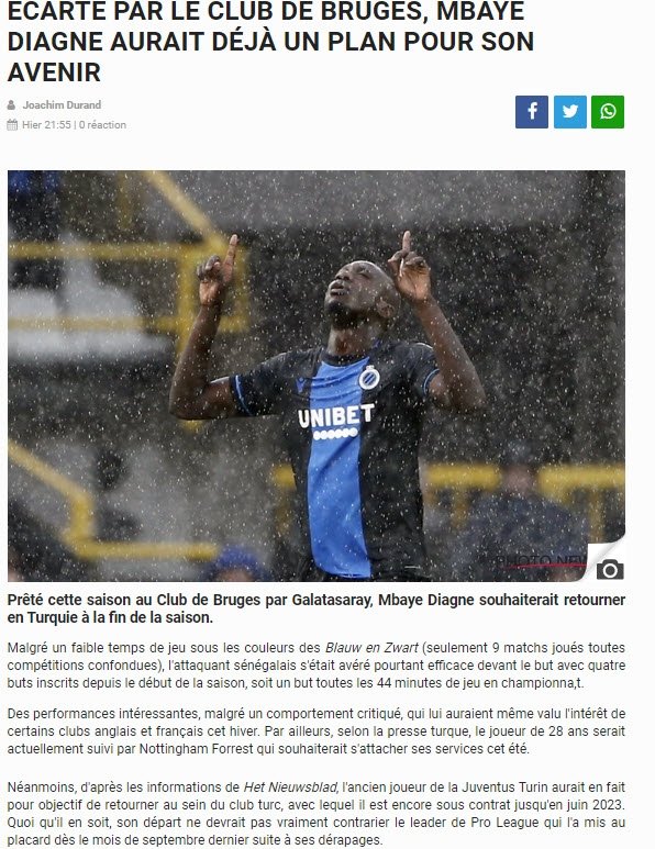 Öte yandan Het Nieuwsblad'ın haberine göre; 2023'e dek Galatasaray ile sözleşmesi bulunan golcü futbolcu, geleceğine ilişkin son kararı verdi. Buna göre Diagne, sezonun sona ermesiyle beraber yeniden Türkiye'ye geri dönmenin ve Galatasaray'da forma giymenin hesaplarını yapıyor.